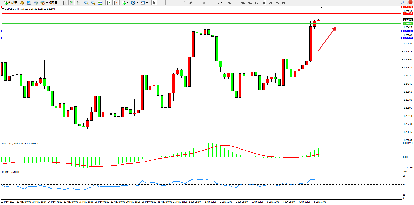 4小时图看:高位多头动力强势上扬,市场看涨情绪依旧,多头有继续向上移动态势,MACD指标处于多头区域不断上行,RSI指标处于多头区域高位整理;