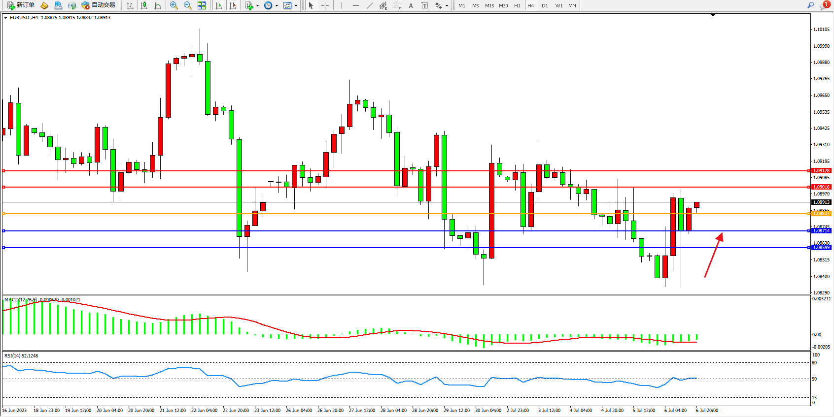 4小时图看:低位多头力度维持震荡上移,短期多头情绪逐渐涌现,MACD指标处于0轴线下侧弱势整理,RSI指标处于50均衡线附近弱势徘徊;