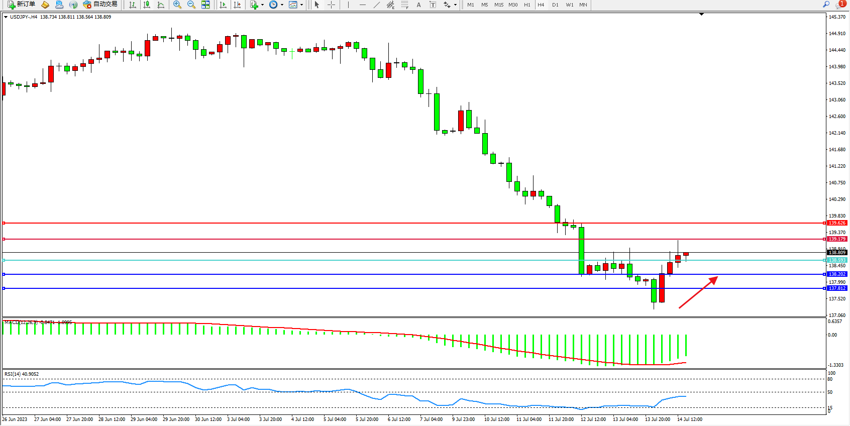 4小时图看:低位短期窄幅震荡后反转震荡上行,市场看涨情绪逐渐涌现,多头动力缓慢上行,MACD指标处于空头区域整理上移,RSI指标低位震荡上行中;