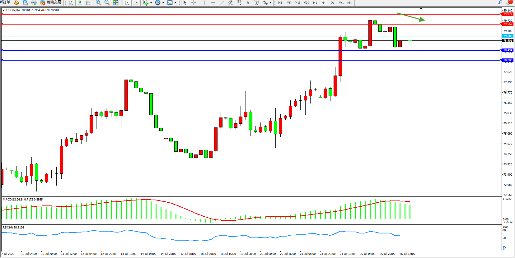 原油维持78.901附近震荡,美国至7月21日当周EIA原油库存 -60万桶,预期-234.8万桶,前值-70.8万桶。EIA俄克拉荷马州库欣原油库存 -260.9万桶,前值-289.1万桶。