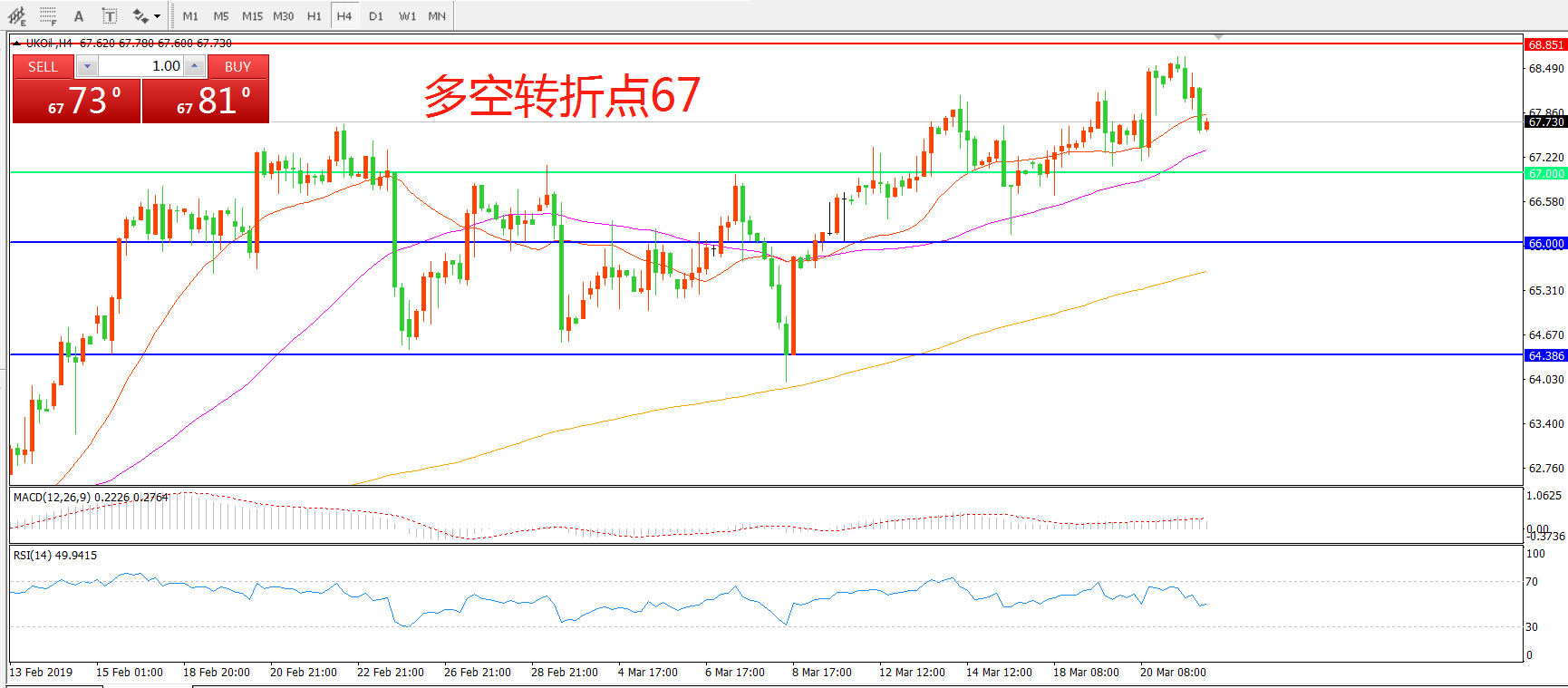 4小时图看,油价触碰68.5美元阻力后小幅回落,但整体上升形态依然完好,均线系统呈多头排列,MACD红柱走平,RSI指标拐头向下,短线有调整可能,但思路上依然以逢低做多为主。