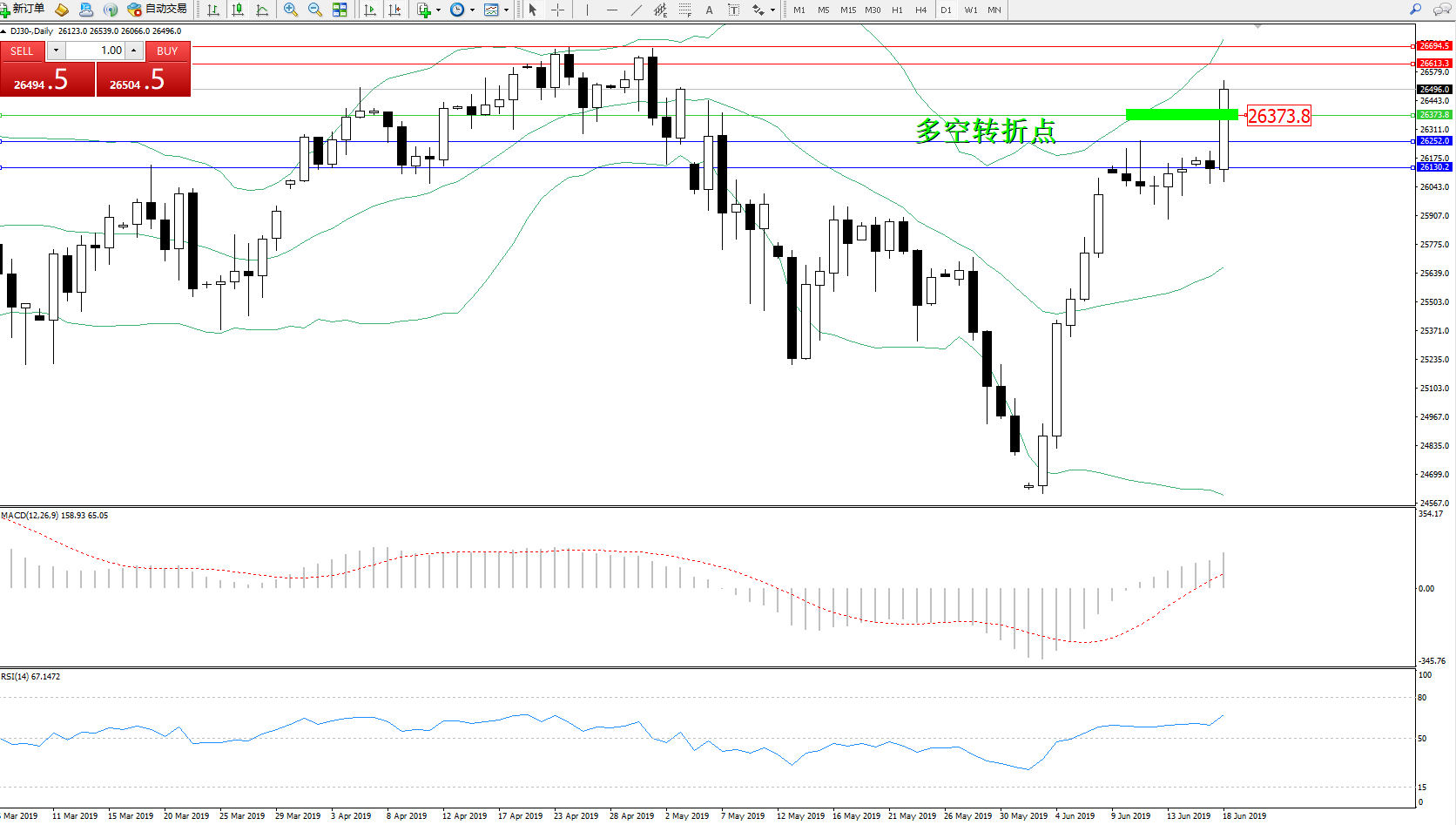 道琼斯指数6月18日(周二)收盘上涨353.00点,涨幅1.35%,报26465.54点。美国股市逼近历史高点,因市场乐观预期特朗普将缓和与中国的贸易紧张关系。受消息刺激,欧美股市大幅走高,道明证券驻多伦多大宗商品策略主管Bart Melek表示,我们看到风险偏好有所回升,股市走高,这扶助美元。全球央行新一轮的宽松竞赛已经全面起跑。如果美联储周三的政策决定不像市场预期的那样鸽派,美元就可能保持相对具有韧性的表现;目前市场预期本周约有20%的降息几率,是错误预期,预示着如果美联储让鸽派预期落空,将利好美元;美国经济仍处于“相对良好的状态”,关键变量是贸易不确定性导致的经济逆风;预计在20国集团峰会上会晤前,美联储将继续保持“观望”;然而,一旦美联储降息,美元就可能走弱;预计美联储将从9月开始以25个基点的速度降息,随后三个季度都会有下调,这将导致美元走软;情况可能类似于1998年,当时美国经济增速在超出潜在水平后放缓。
