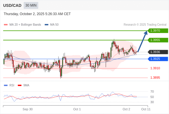 在 1.3925 之上,看涨,目标价位为 1.3955 ,然后为 1.3970 。