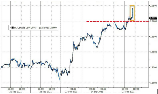 30年期美债收益率晚间一度飙升至近2.05%水平。