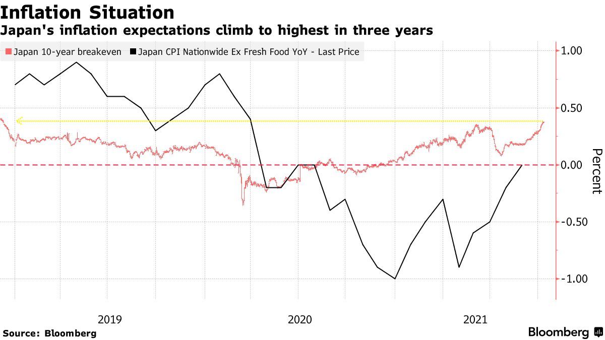 全球投资者对通胀将持续一段时期的担忧已经蔓延到有通缩倾向的日本。数据显示,该国的10年期盈亏平衡利率本周攀升至2018年以来的最高水平。