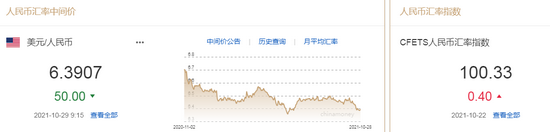 10月29日,人民币(6.4056, 0.0138, 0.22%)中间价报6.3907,上调50点,上一交易日中间价报6.3957,在岸人民币上一交易日收报6.4006。
