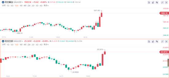 美国CPI数据公布后,现货黄金上破1970美元/盎司,为3月14日以来新高,日内涨超0.8%。现货白银日内涨幅扩大至1.00%。