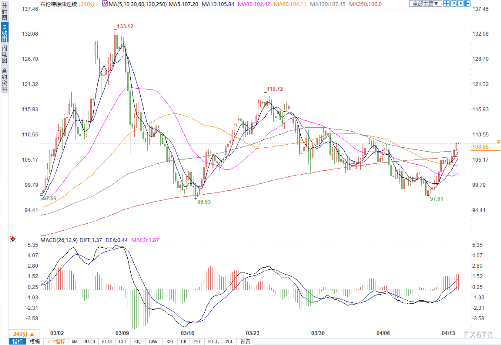 周三(4月13日)美油期货上涨3.7%,结算价报104.25美元/桶。此前一天,两大指标原油都攀升了6%以上。消息人士称,全球主要贸易公司计划最早在5月15日减少从俄罗斯国有石油公司购买原油和燃料,以避免与欧盟对俄罗斯的制裁相冲突,推动油价继续上行。