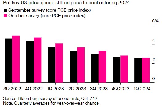 彭博社对经济学家的最新月度调查显示,被美联储视为首选通胀指标的核心PCE物价指数或将在明年第四季度年均上升2.8%以及2024年第一季度上升2.6%。该调查是在9月CPI报告发布之前进行的。