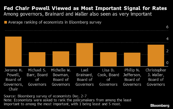 以上为一项调查得出的结论,经济学家选出美联储主席和纽约联储行长John Williams作为需要倾听的主要官员,其次是副主席布雷纳德。