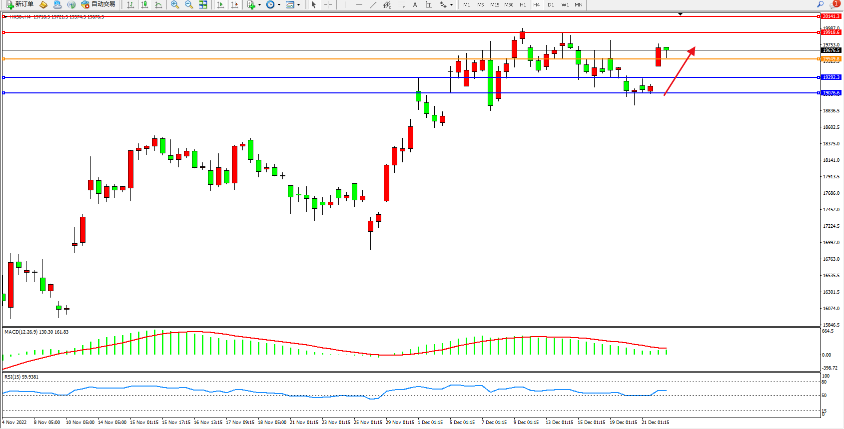 4小时图看:多头动力高开高走,短期多头情绪涌现,市场不断攀升,MACD指标处于多头区域缓慢整理上移,RSI指标处于50均衡线上側弱势徘徊中;