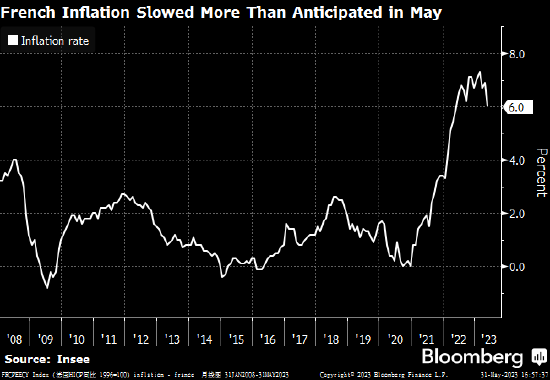 周三公布的数据显示,该欧元区第二大经济体5月份消费者价格同比涨幅,从4月份的6.9%收窄至6%。此前经济学家仅预期会降至6.4%。