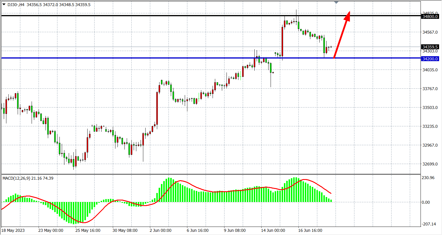 4小时图看,道指在34800之下进一步回落,触及支撑34200有效止跌,MACD量能在零轴上快速缩量,行情回调延续,下方支撑34200,上方阻力34600-34800。