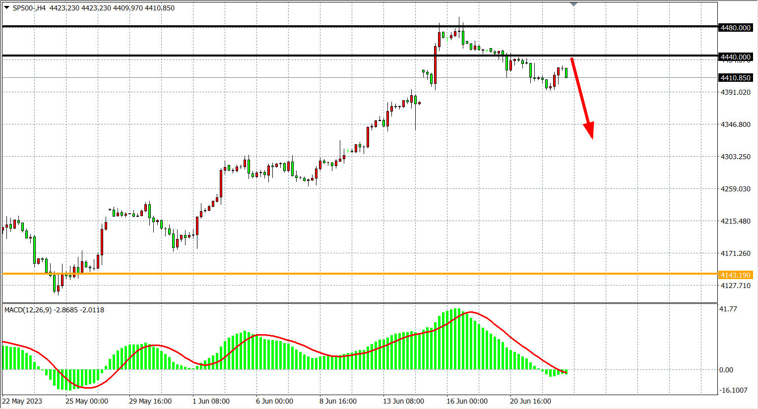 4小时图看,标普继续回落,压力下移4440附近,MACD量能在零轴附近缩量,行情进入回调,压力4440-4480,下方支撑4380-4350。
