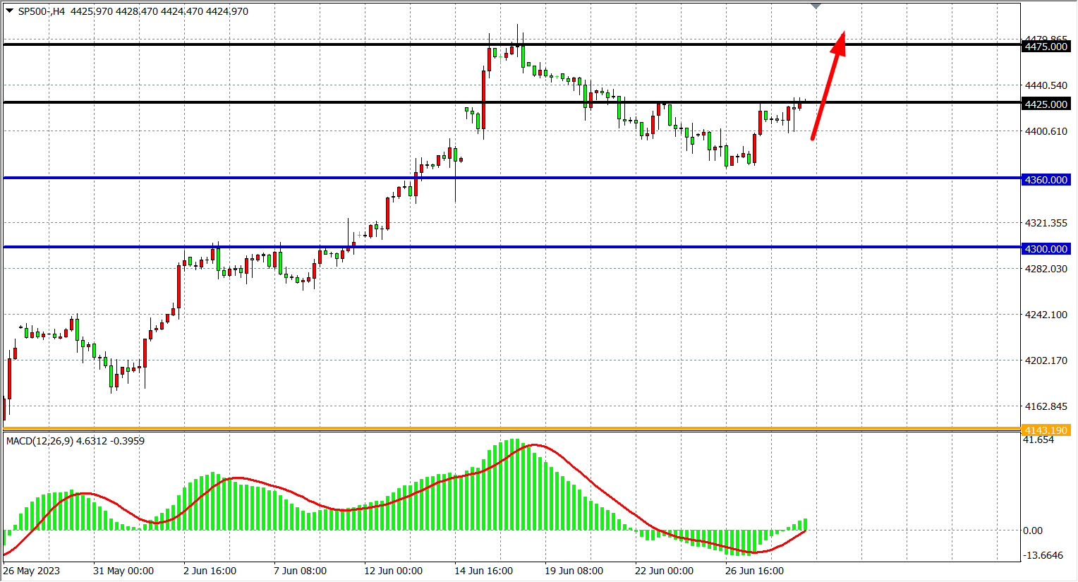 4小时图看,标普在4425附近继续盘整,MACD量能上穿零轴小幅放量,行情开启反弹势头,重点关注4425得失,该位之上看涨,之下看跌。