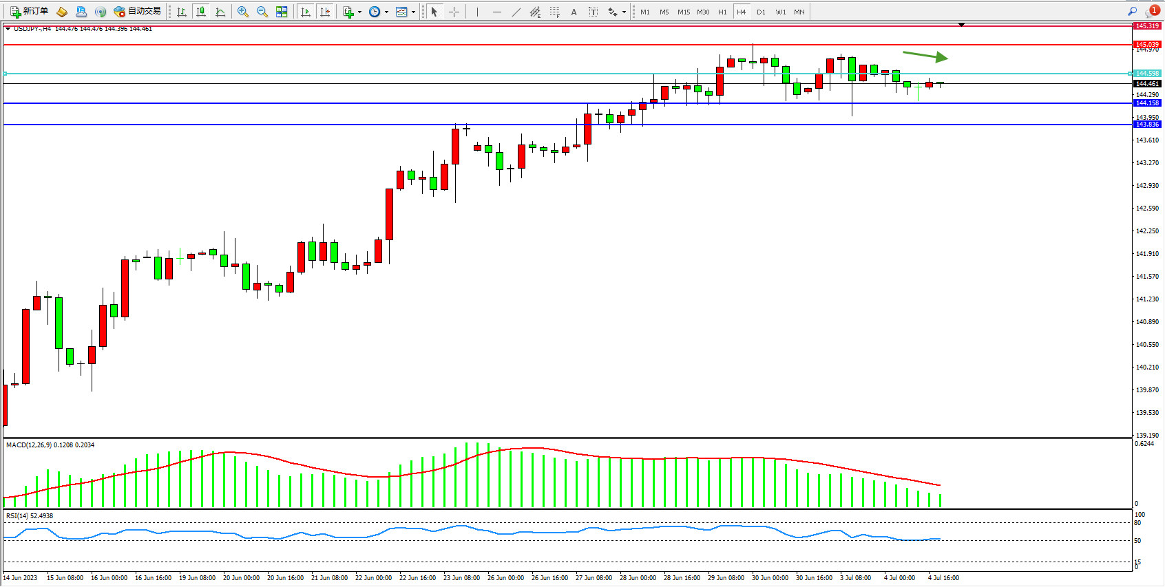 备选策略:144.598上方看涨,目标145.039 145.319