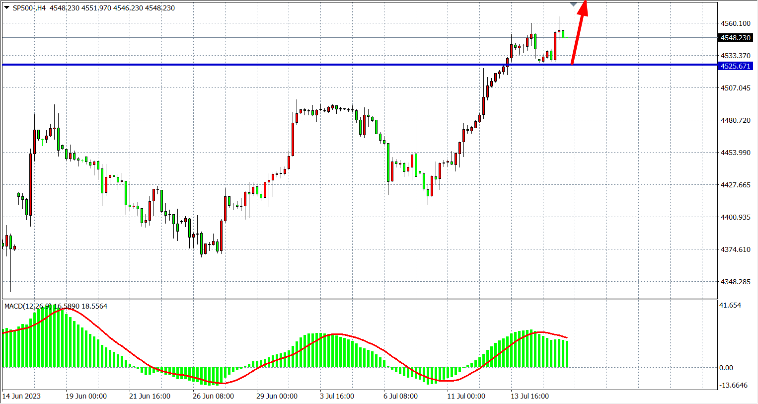 4小时图看,标普在4525之上继续走高,MACD量能在零轴上持续放量,趋势延续上涨格局不变,当前支撑关注4525,上方阻力4580-4630。