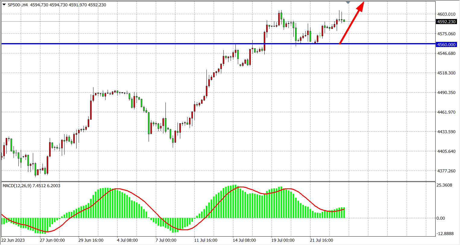 4小时图看,标普在4560上继续走高,MACD量能在零轴上温和放量,支撑继续关注4560附近,上方阻力看4600-4640。