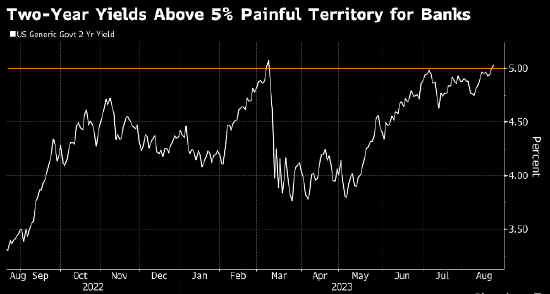 2年期美国国债收益率本周升至5%,道明银行美国利率策略主管Gennadiy Goldberg周二接受采访时表示,这代表“许多银行进入秋季之际将陷入痛苦交易”。