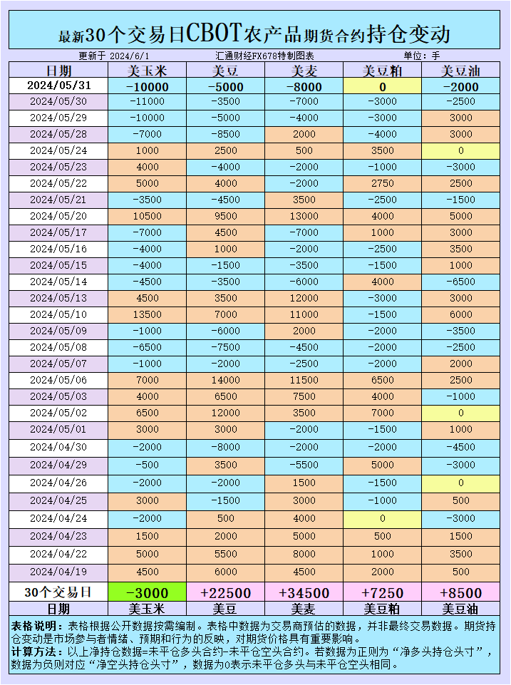 根据知名机构汇通财经的观察,海外交易商估算的结果显示,大宗商品基金在CBOT市场的持仓变动呈现分化态势。具体来看,玉米和小麦的投机性净空头头寸有所增加,而豆粕的未平仓多头与未平仓空头保持平衡。在最近30个交易日中,大宗商品基金对玉米的投机性净空头头寸持续增加,而大豆、小麦和豆粕的投机性净多头头寸则有所增加。具体变动数据详见图表。
